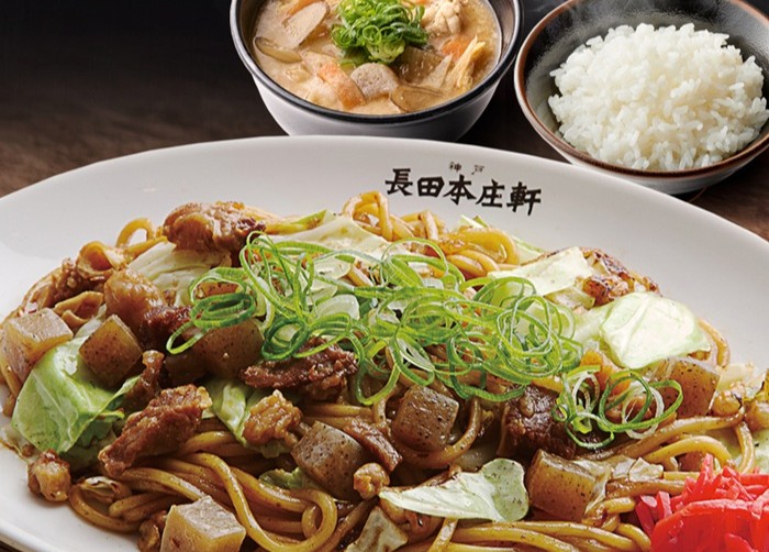 「長田本庄軒」のこだわりは、なんといっても店内で製麺される「熟成自家製麺」。もちもちとした食感の中太麺を、注文ごとに巨大な鉄板で一気に焼き上げます。