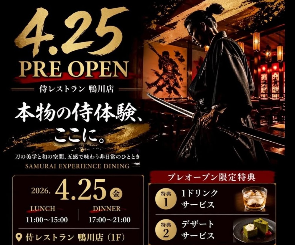 2026年4月25日(土)、京都市下京区にプレオープンを迎えるのは「侍レストランおまかせ 鴨川店」。