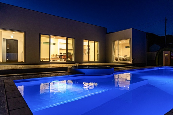 - プライベートプール: 中庭に広がる開放感抜群のプール。夜には水中照明が幻想的に輝き、ナイトプールも楽しめます。